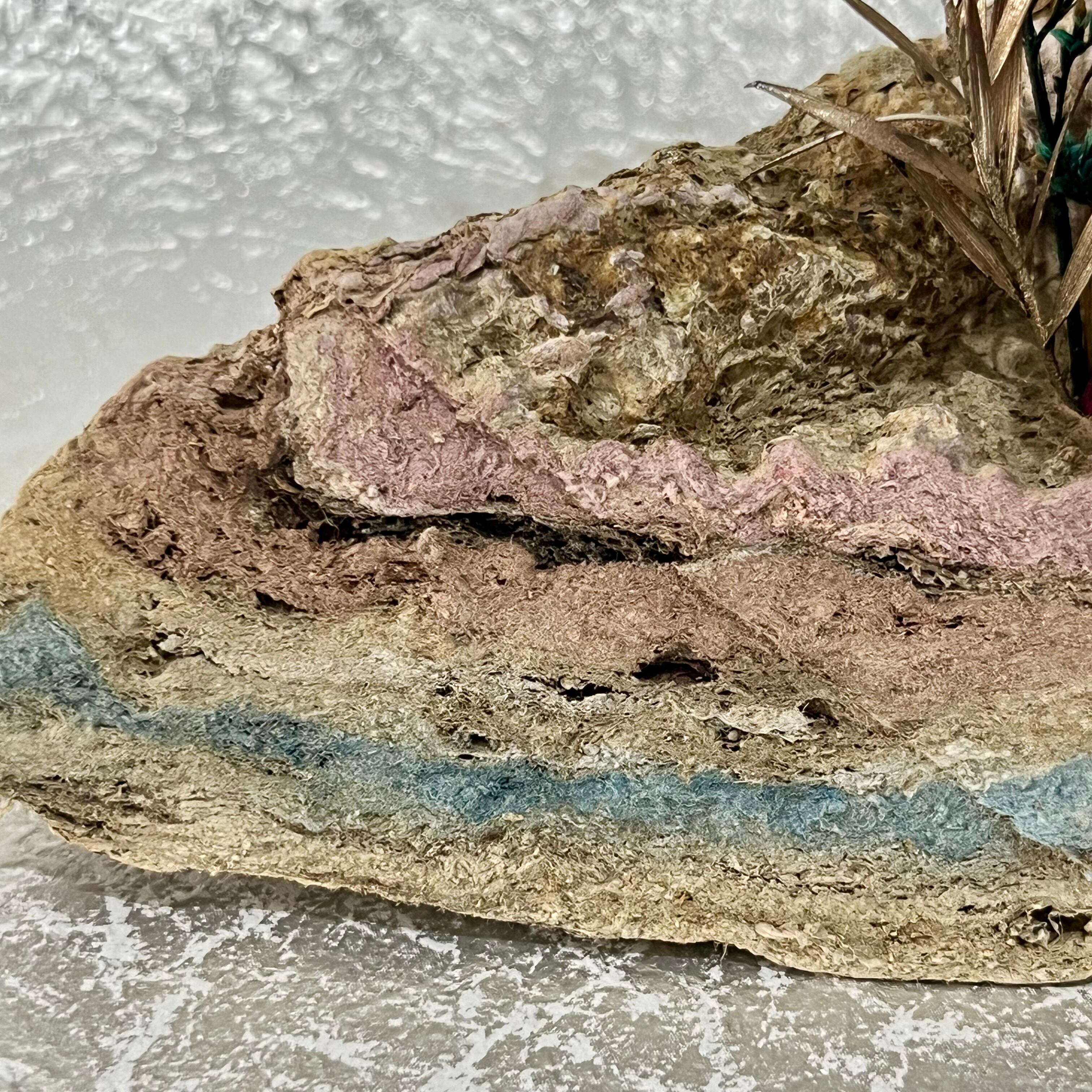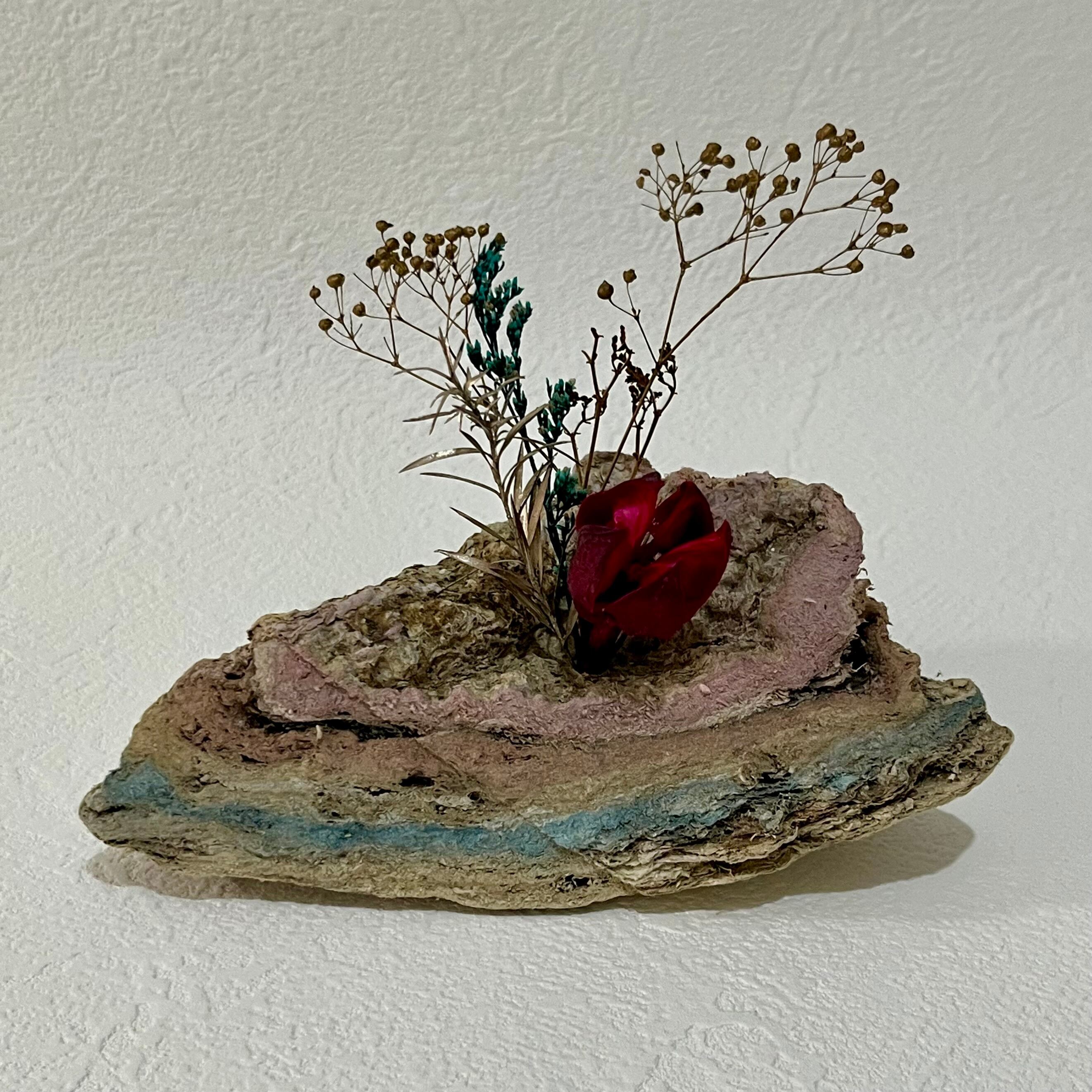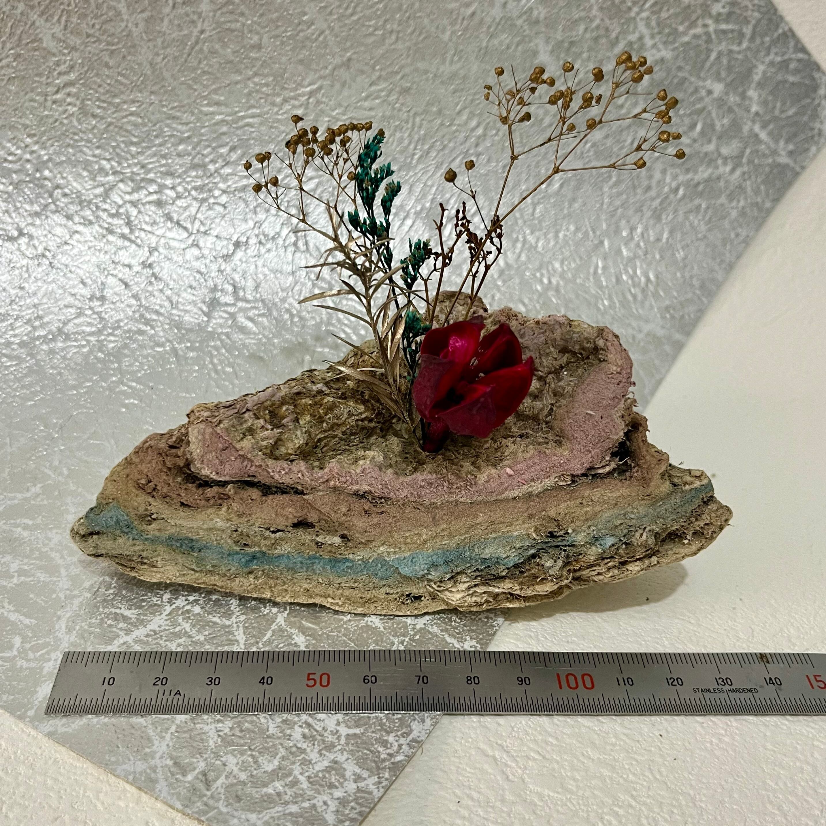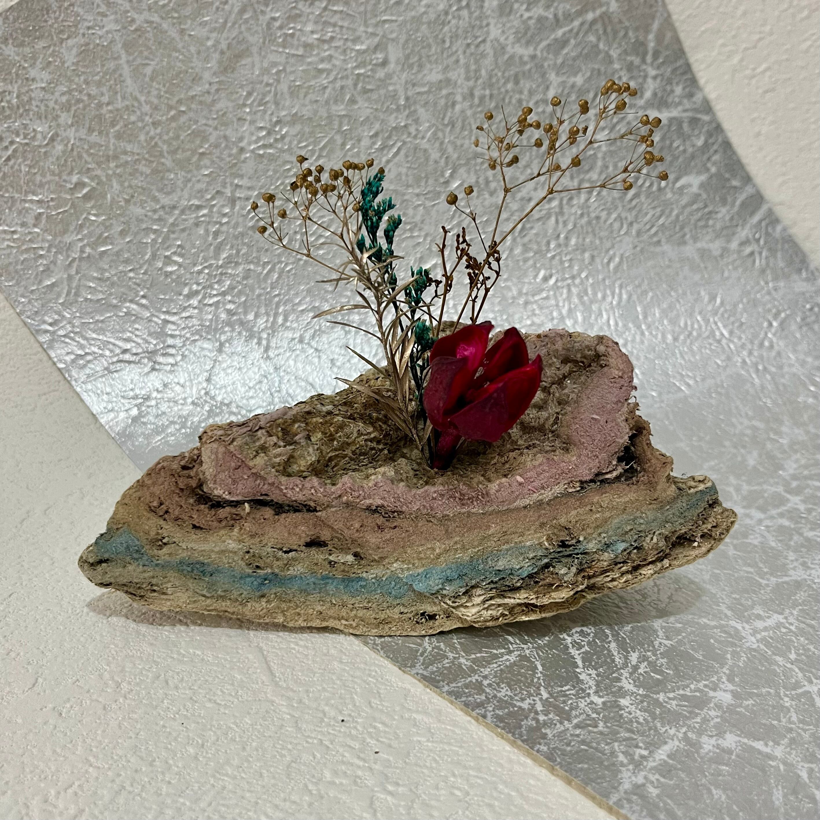 メモや落書きや絵などの思考、心情を記した痕跡が残る紙を、再生紙などの作り方を応用して、自然物のような立体表現を行う。