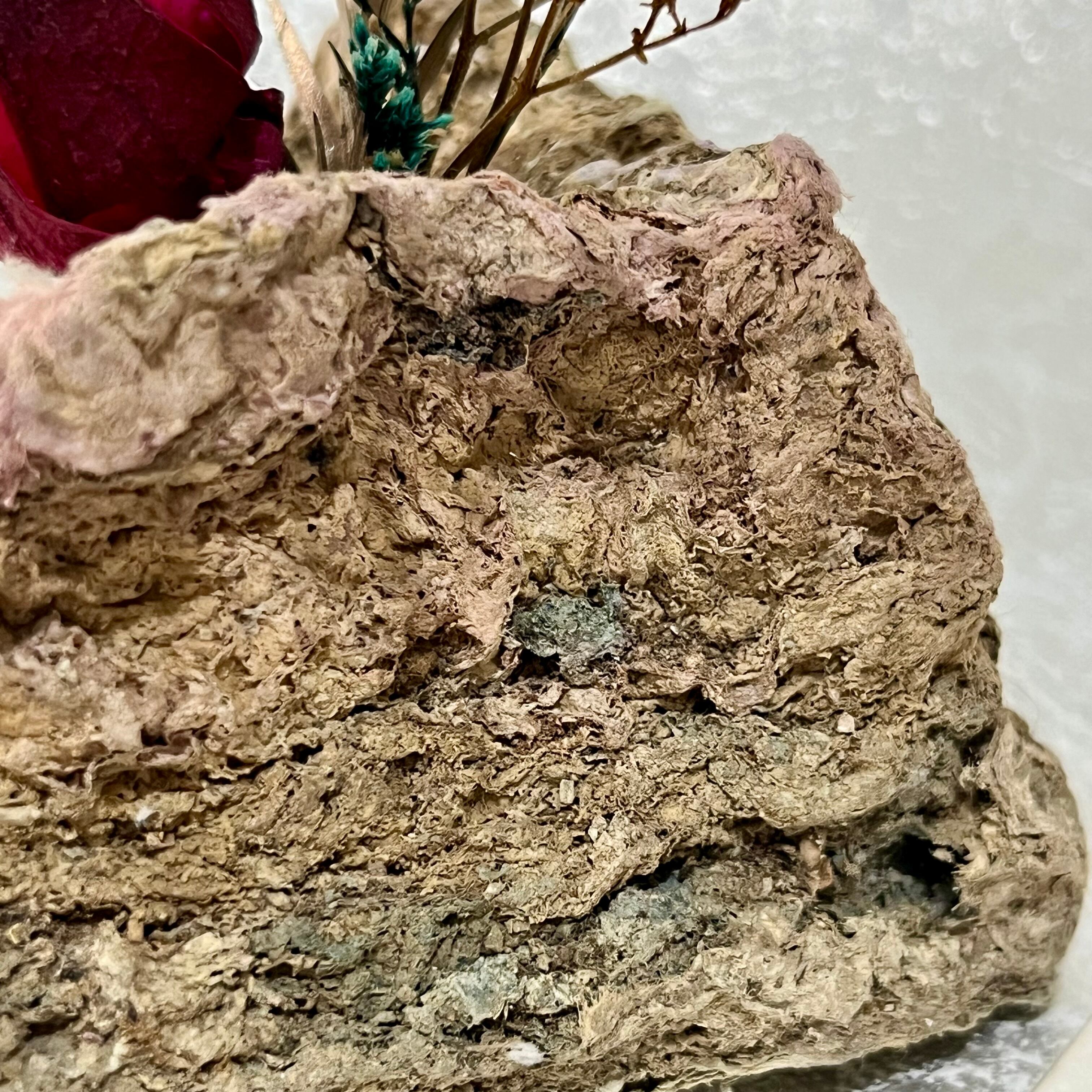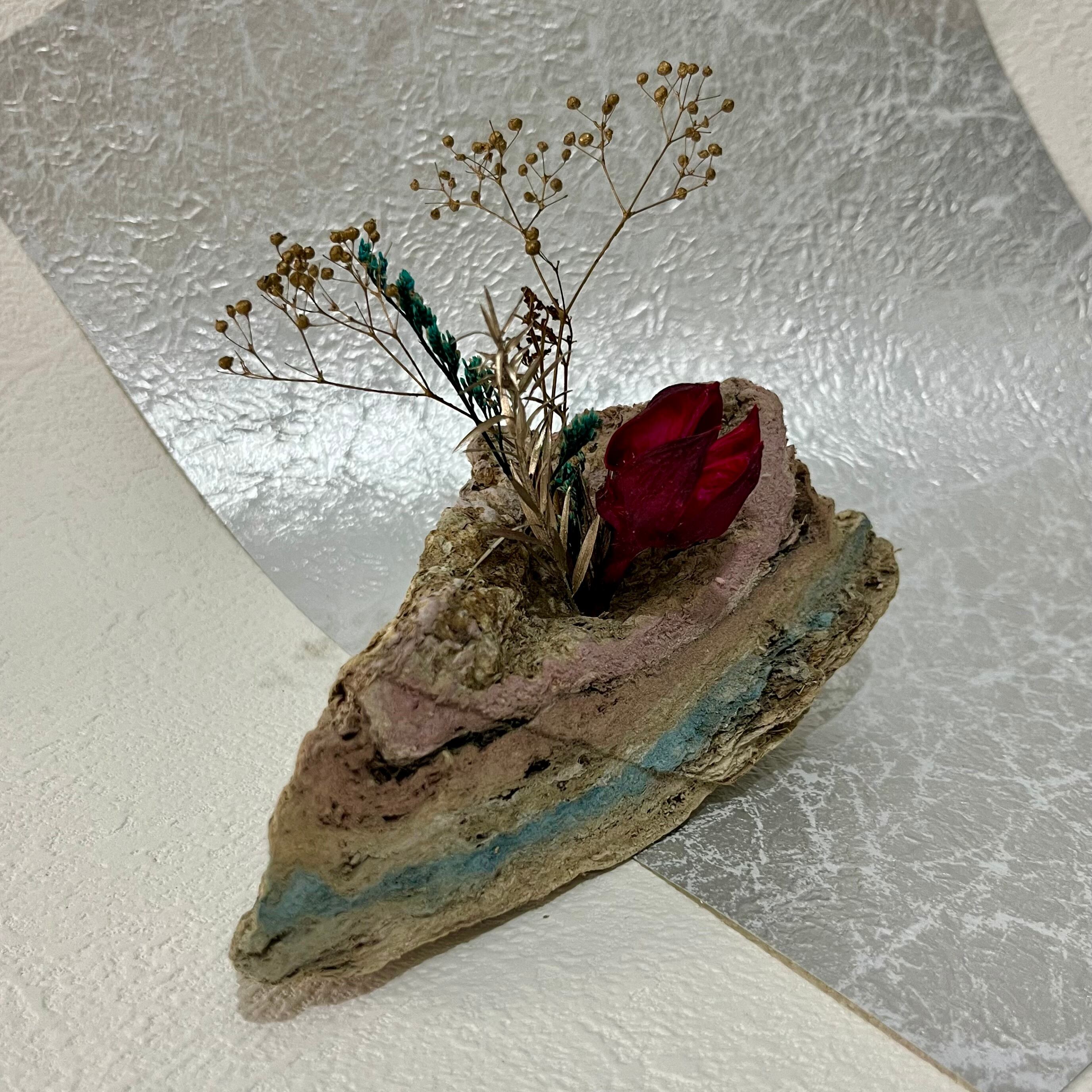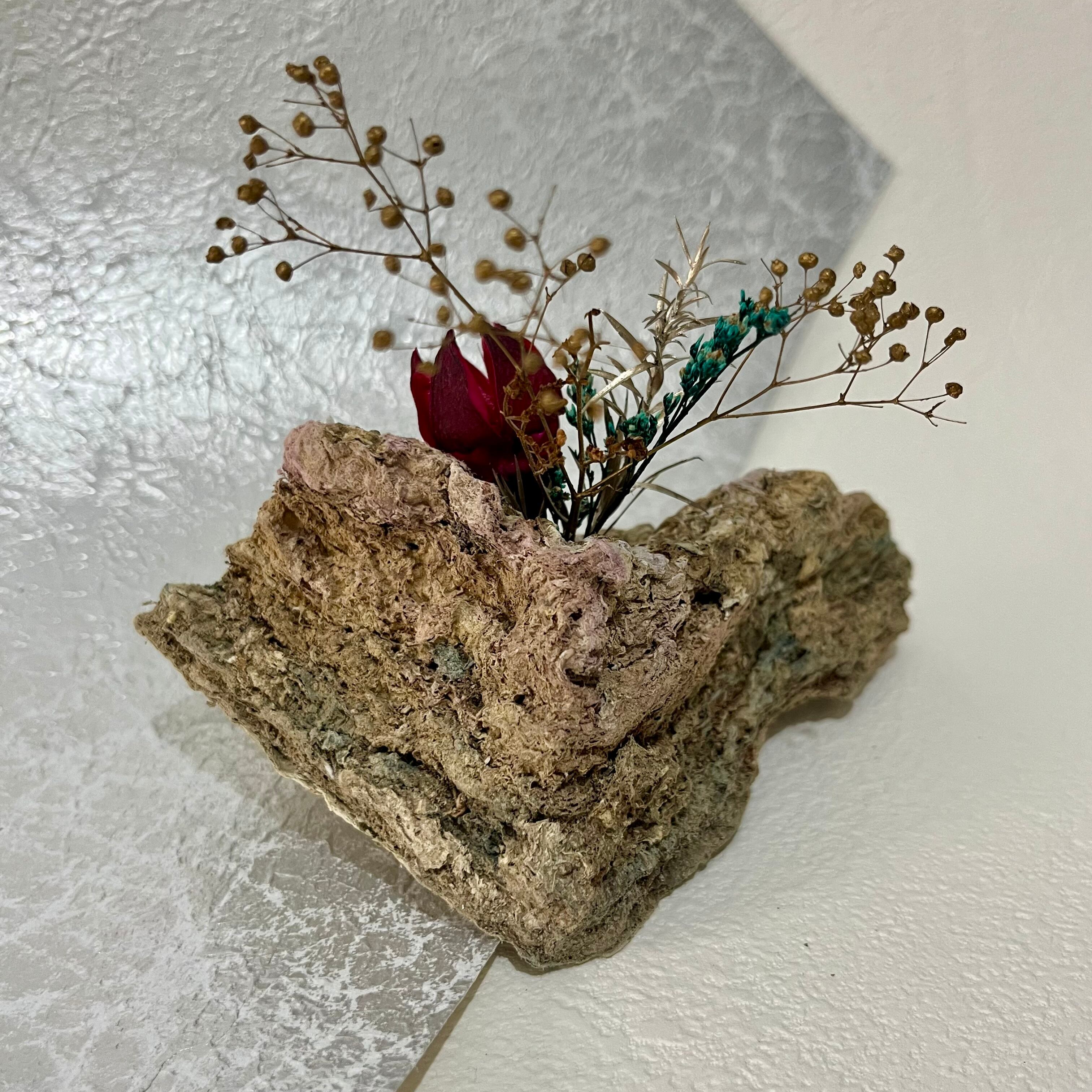 具体的な彫刻作品とは違う、地層や岩肌に似た風合いが特徴的で、見た目からは想像もつかないほど軽く、簡単に穴を開けて加工するなどの工夫が可能。